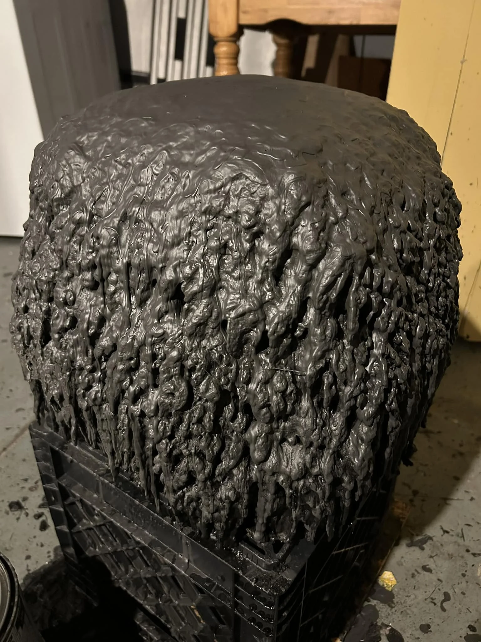 The Black Painting is a daily performance where one layer of black paint is applied to the surface everyday by Skip until his death or inability. The project began in 2007 on a store bought, pre-stretched 10'' square canvas and continues today. It is currently gaining approximately 6 pounds a year but grows exponentially. The piece began as an impulse to permanently connect to the material and practice of painting. It seeks to remove all aesthetic decisions of painting while still referencing the act of painting, performance, and the history of black paintings. Unlike many black paintings of the past, (Kazimir Malevich, Ad Reinhardt, Robert Rauschenberg, Frank Stella, Ellsworth Kelly, Mark Rothko, etc.,) this work is not intended to be the end or a new beginning but rather only concerns itself with the present.